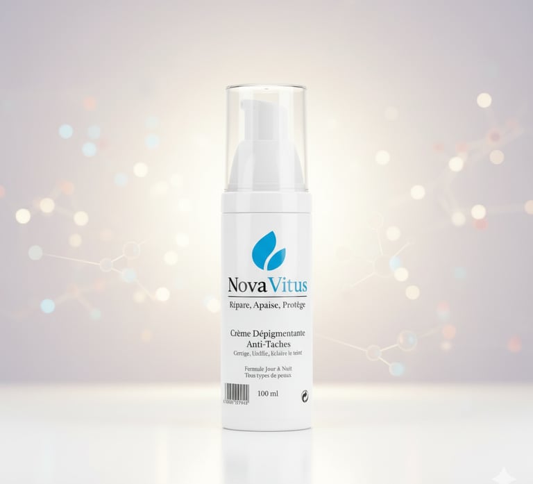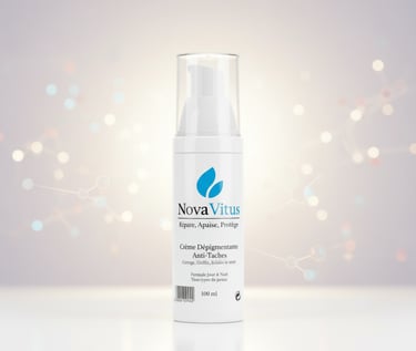 Crème Dépigmentante Anti-Taches NovaVitūs est une solution avancée, formulée pour cibler efficacement les hyperpigmentations et uniformiser le teint. Fruit de nos recherches en dermo-cosmétique, elle agit en profondeur pour corriger les taches existantes et prévenir l'apparition de nouvelles, redonnant ainsi à votre peau toute sa clarté et son éclat naturel.