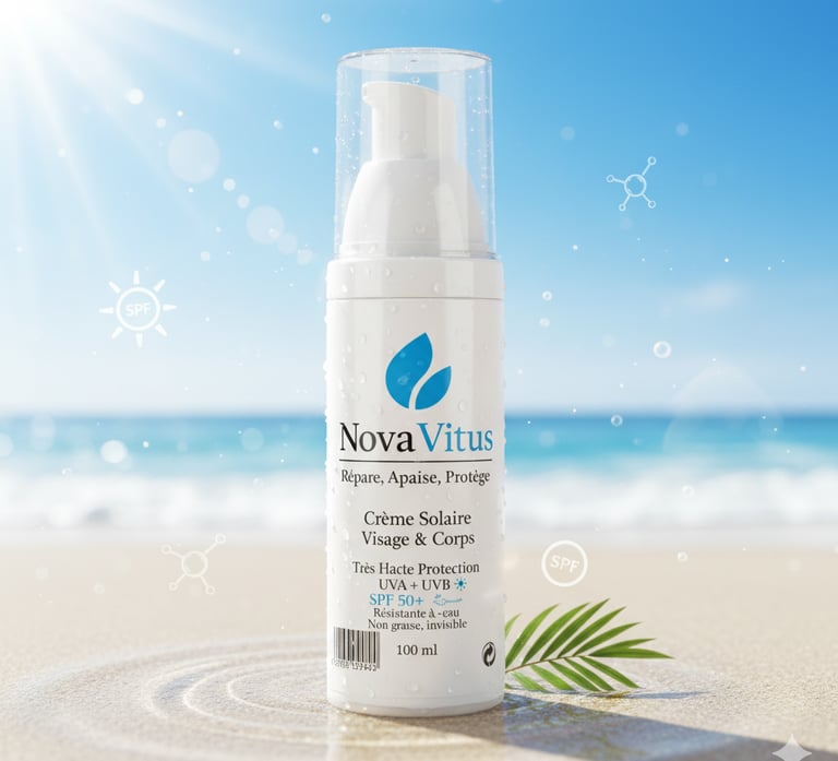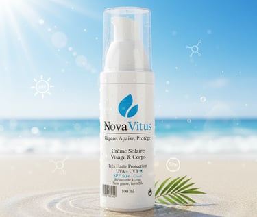 Découvrez la Crème Solaire Visage & Corps NovaVitūs, votre alliée indispensable pour une protection solaire efficace et respectueuse de votre peau. Conçue pour offrir une Très Haute Protection (SPF 50+) contre les rayons UVA et UVB, elle est le fruit de notre engagement à allier science et performance pour la santé de votre épiderme