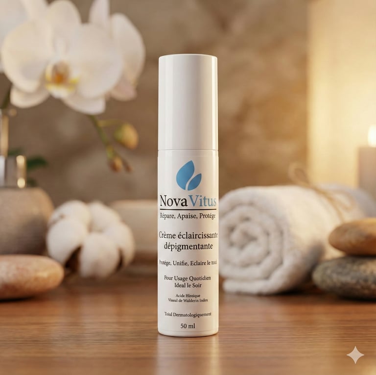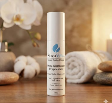 La Crème Dépigmentante Intensive Nuit NovaVitus agit au cœur du cycle naturel de régénération cutanée pour cibler les causes profondes des taches (mélasma, lentigos, marques post-acné) et révéler un teint plus clair, plus uniforme.